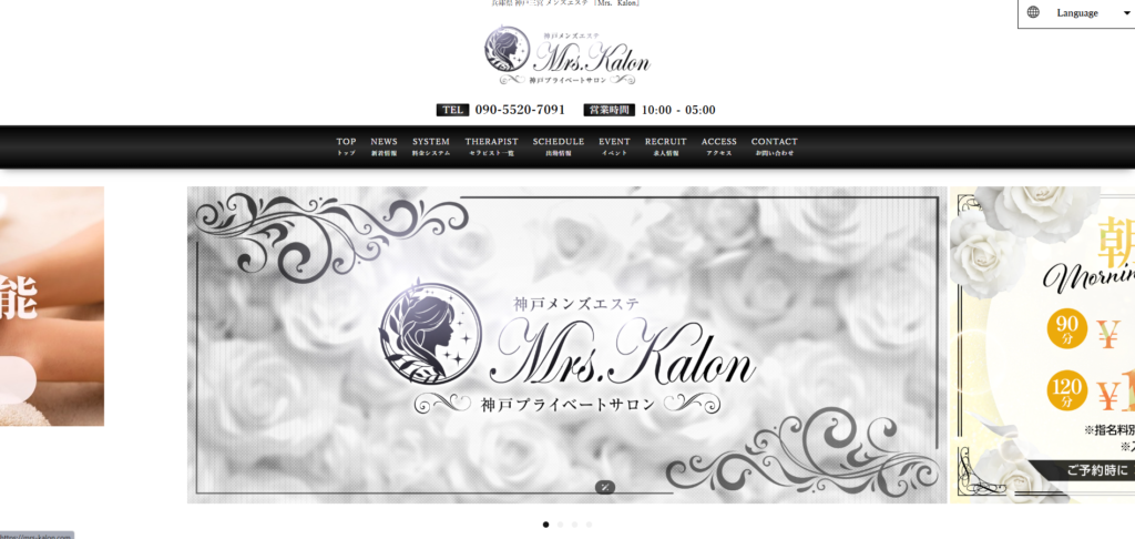 神戸三宮エリアにあるメンズエステ「Mrs.Kalon」は、三ノ宮駅から徒歩7分の好立地にございます。10:00から翌5:00までの長時間営業で、お忙しい男性の様々なライフスタイルに対応しております。優しく上品なミセス系セラピストが在籍し、熟練の技術による本格的なオイルマッサージで日頃の疲れを癒してくれます。容姿端麗で癒し系のテクニシャンが揃い、リラクゼーション効果の高い施術をご提供。初回限定のお得なプランもご用意しており、神戸でワンランク上の癒し体験をお求めの方におすすめのサロンです。