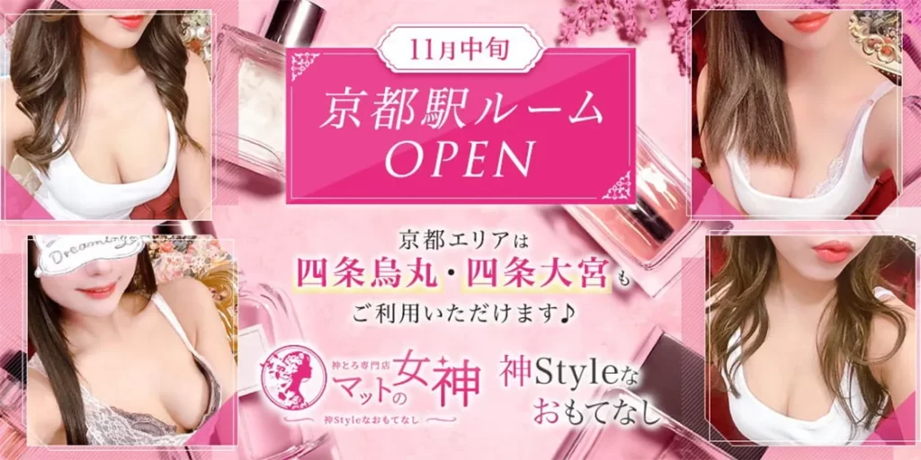 京都市烏丸駅から徒歩3〜5分の好立地にある「マットの女神 京都」は、とろとろマッサージを専門とする上質なメンズエステサロンです。熟練の女性セラピストが、特別なオイルを使用したマットマッサージで、日頃の疲れやストレスを丁寧にほぐします。13時から翌朝5時まで営業しているため、お仕事帰りや深夜のお時間でもご利用いただけます。京都の中心部で極上のリラクゼーションタイムをお過ごしください。心身ともに癒される至福のひとときをご提供いたします。