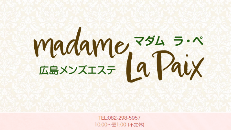 広島市中区に位置する「マダムラペ」は、30歳前後から45歳までの落ち着いた大人のセラピストによる上質なリラクゼーションサロンです。的場駅から徒歩0分という抜群のアクセスで、10:00から翌1:00まで営業しており、お忙しい方でも通いやすい環境を整えております。80分13,000円からのリーズナブルな料金設定で、オイルマッサージによる本格的な癒しのひとときをご提供。お肌の弱い方にも安心してご利用いただけるよう、専用オイルもご用意しております。大人の女性ならではの包み込むような温かいおもてなしで、日頃の疲れを癒しませんか。