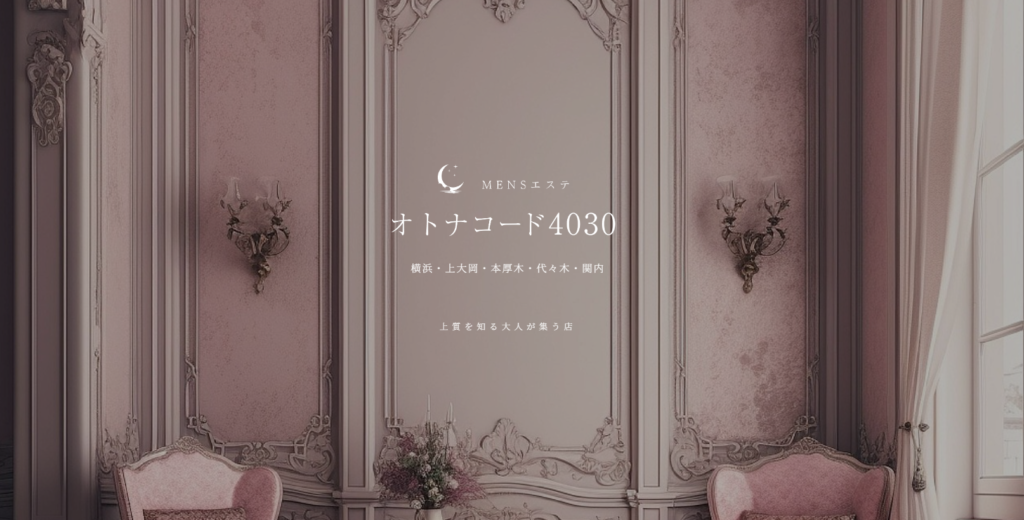 オトナコード4030横浜ルームは、横浜・関内エリアに位置する上質な大人向けメンズエステサロンです。経験豊富で魅力的なセラピストが、丁寧なオイルマッサージで日々の疲れを癒します。10:00〜25:00の営業時間で、お忙しい方でもお気軽にご利用いただけます。清楚で美しいセラピストによる本格的なリラクゼーション施術で、心身ともにリフレッシュしていただけます。旧オトナクチュールからリニューアルし、より洗練されたサービスをご提供。上質な癒しの時間をお求めの大人の男性に最適なプライベート空間です。