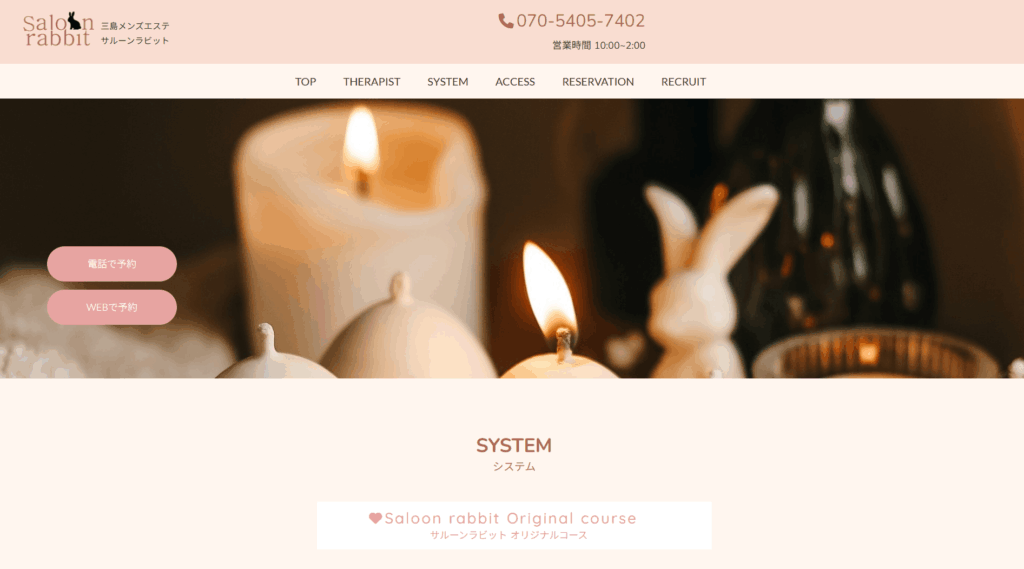 三島エリアに新規オープン落ち着いたエリアに佇む「うさぎ」コンセプトのメンズエステ。白を基調とした清潔感あふれる完全個室で、静かに癒しの時間をお過ごしいただけます。派手さではなく、丁寧な施術と心配りを重視。心と身体がゆっくりほどける、上質なリラクゼーションをご体感ください。